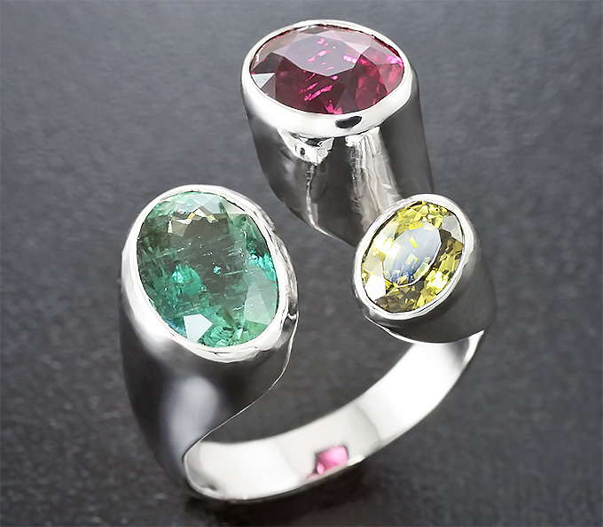 Кольцо с полихромным индиголит турмалином, демантоидом и рубеллитом