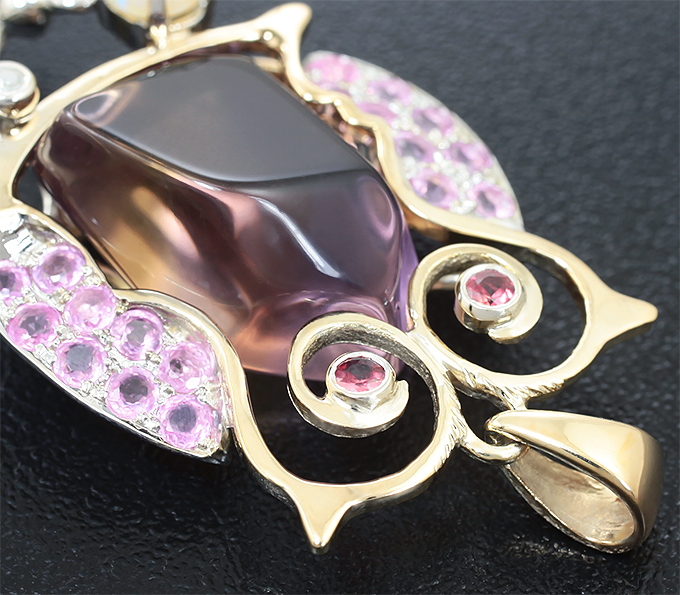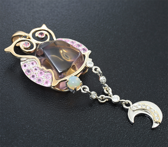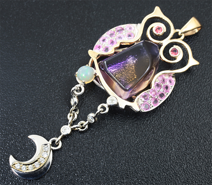 Кулон «Сова» с аметрином, эфиопским опалом и разноцветными сапфирами