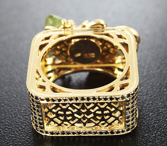 Вашему вниманию предлагается кольцо из желтого золота 750 пробы с перидотом, цаворитами гранатами, 224 черными и 40 бесцветными бриллиантами! Диаметр дополнительной инкрустации от 1 мм до 2 мм. Площадка 25 х 16 мм, высота 12 мм. Вес изделия 21,6 г. Размер 18,75. Ниже приводятся ювелирные характеристики перидота.