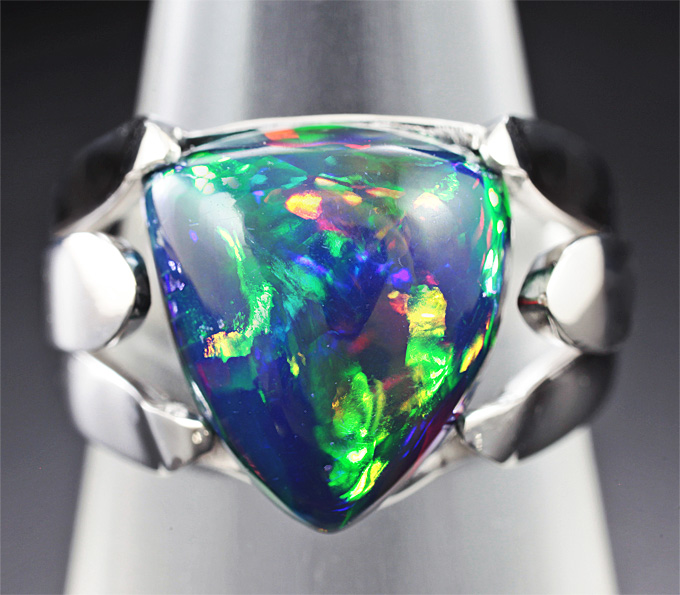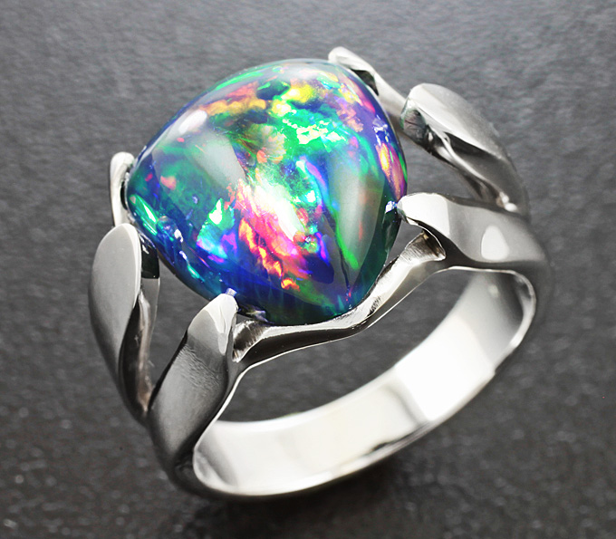 Вашему вниманию предлагается кольцо из белого золота 585 пробы с кристаллическим черным опалом! Основные цвета опалесценции: красный, желтый и зеленый. Ширина площадки 12 мм, высота 7 мм. Вес изделия 5,7 г. Размер 15,25. Ниже приводятся ювелирные характеристики вставки.