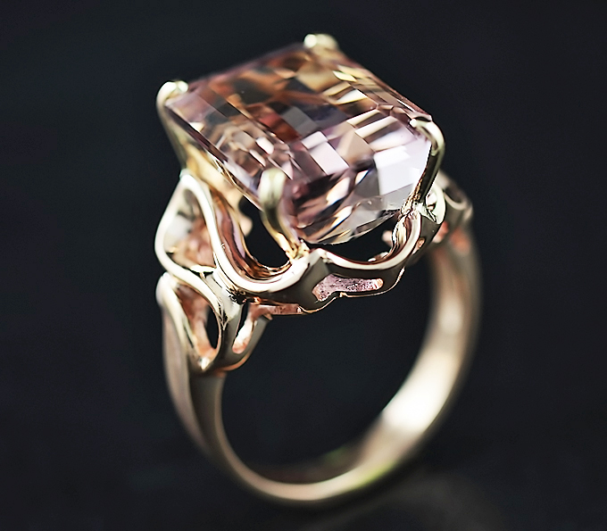 Вашему вниманию предлагается кольцо из красного золота 585 пробы c чистейшим аметрином! Площадка 21 х 18 мм, высота 10 мм. Вес изделия 7,5 г. Размер 17,5. Ниже приводятся ювелирные характеристики вставки.