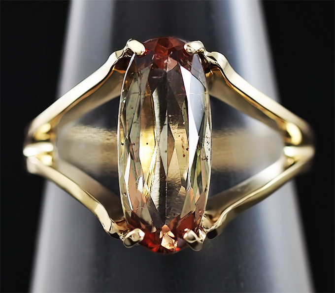 Вашему вниманию предлагается кольцо из желтого золота 585 пробы с андалузитом! Площадка 14 х 6 мм, высота 4 мм. Вес изделия 3,3 г. Размер 18. Ниже приводятся ювелирные характеристики вставки.