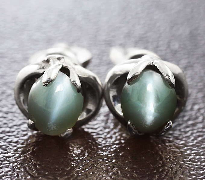 Пусеты, инкрустированные хризобериллами с эффектом «кошачьего глаза»