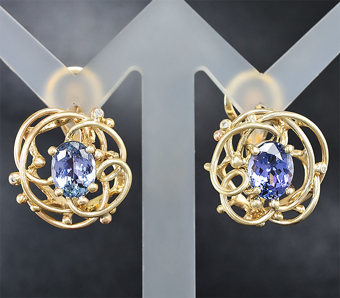 Вашему вниманию предлагаются серьги из желтого золота 585 пробы с танзанитами и бриллиантами! Диаметр дополнительной инкрустации 1 мм. Площадка серег 18 х 17 мм. Вес пары 8,8 г. Ниже приводятся ювелирные характеристики вставок.