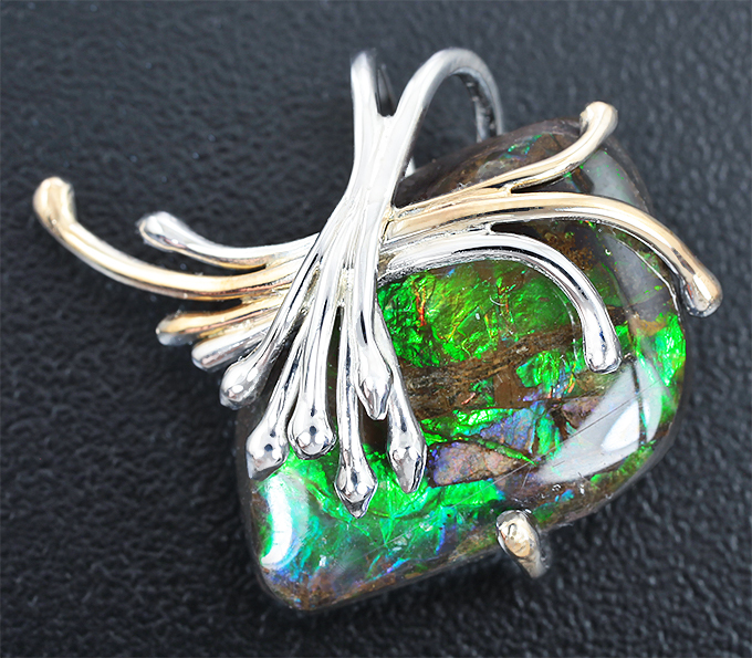 Вашему вниманию предлагается кулон из стерлингового серебра (925 проба) с аммолитом аммонита! Изделие частично позолочено. Площадка кулона 28 х 23 мм. Вес 5,7 г. Ниже приводятся ювелирные характеристики вставки.