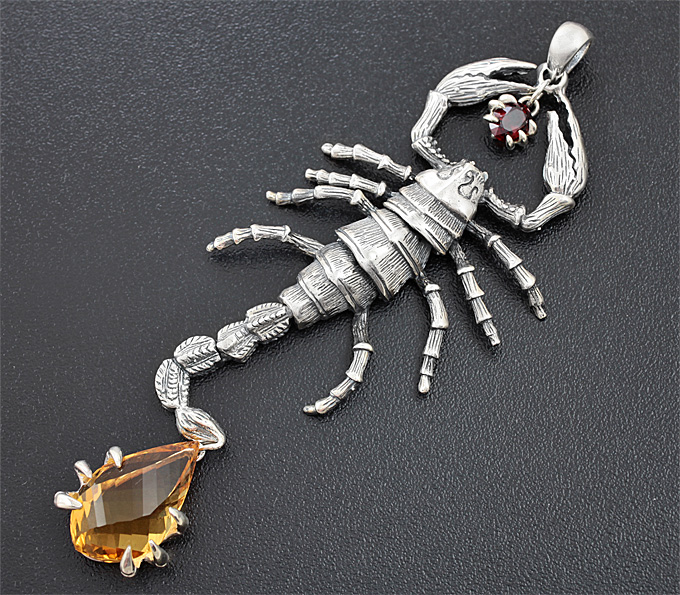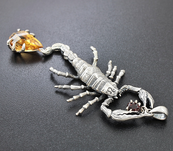 Вашему вниманию предлагается кулон «Скорпион» из стерлингового серебра (925 проба) с цитрином и красной шпинелью! Размеры кулона с петлей 113 х 43 мм. Вес 37,1 г. Ниже приводятся ювелирные характеристики вставок.