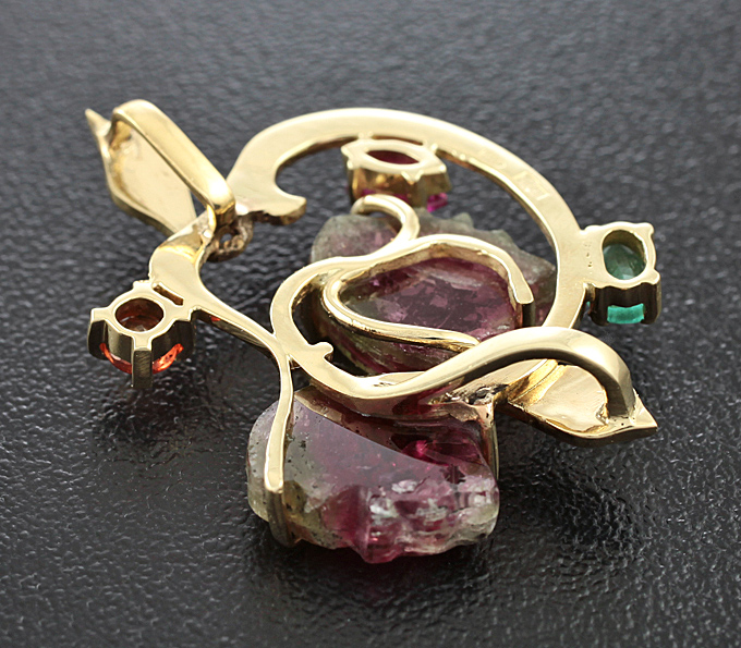 Кулон с резными арбузными и разноцветными ограненными турмалинами