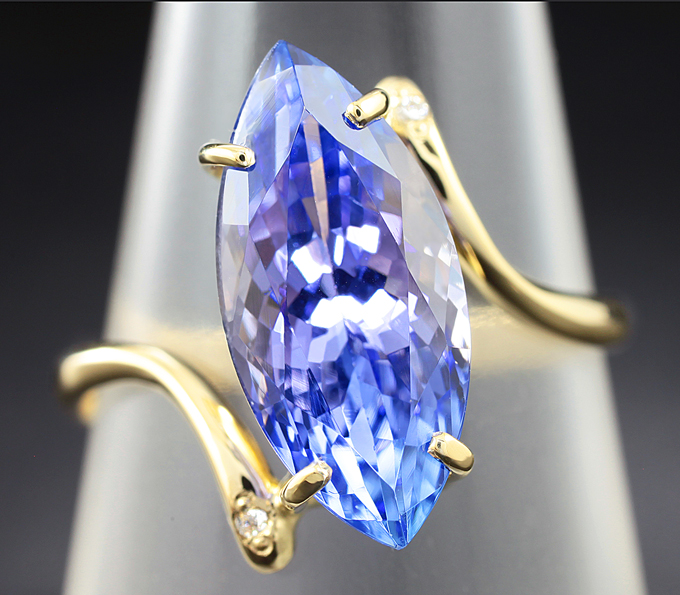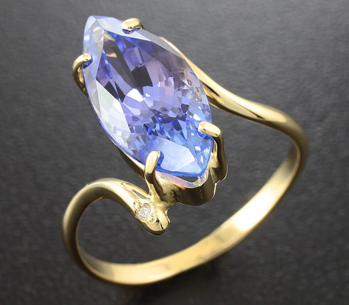 Вашему вниманию предлагается кольцо из желтого золота 585 пробы c танзанитом и 2 бриллиантами! Диаметр дополнительной инкрустации 2 мм. Ширина площадки 16 мм, высота 6 мм. Вес изделия 3,3 г. Размер 18. Ниже приводятся ювелирные характеристики танзанита.
