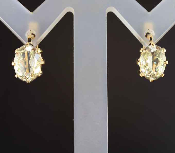 Вашему вниманию предлагаются серьги из желтого золота 585 пробы с диаспорами! При смене освещения камни приобретают розовый нацвет. Площадка серег 11 х 7 мм. Вес пары 2,9 г. Ниже приводятся ювелирные характеристики вставок.