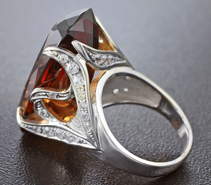 Вашему вниманию предлагается кольцо из стерлингового серебра (925 проба) c империал топазом и бесцветными цирконами! Диаметр дополнительной инкрустации от 1,5 мм до 2 мм. Площадка 26 х 19 мм, высота 12 мм. Вес изделия 12,5 г. Размер 17. Ниже приводятся ювелирные характеристики топаза.