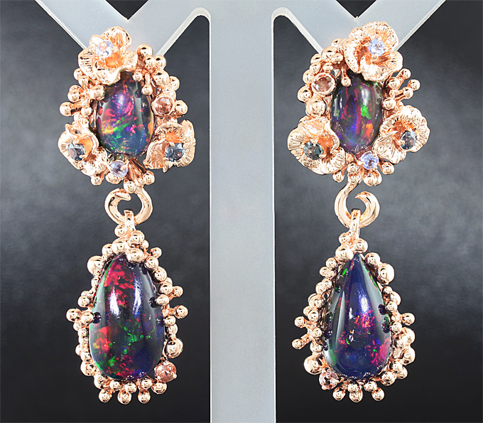 Серьги с кристаллическими черными опалами, танзанитами, андалузитами и гранатами со сменой цвета