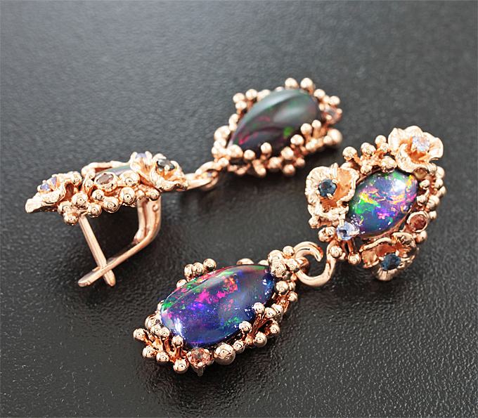 Вашему вниманию предлагаются серьги из розового золота 585 пробы с кристаллическими черными опалами, танзанитами, андалузитами и гранатами со сменой цвета! Основные цвета опалесценции: красный, желтый и зеленый. При смене освещения гранаты меняют свой цвет с сине-зеленого на темно-пурпурный. Диаметр дополнительной инкрустации 2 мм и 2,5 мм. Площадка серег 47 х 17 мм. Вес пары 17,8 г. Ниже приводятся ювелирные характеристики опалов.