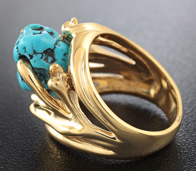 Вашему вниманию предлагается кольцо из стерлингового серебра (925 проба) c аризонской бирюзой с включениями пирита! Изделие позолочено. Площадка 20 х 17 мм, высота 12 мм. Вес изделия 12,2 г. Размер 18. Ниже приводятся ювелирные характеристики вставки.