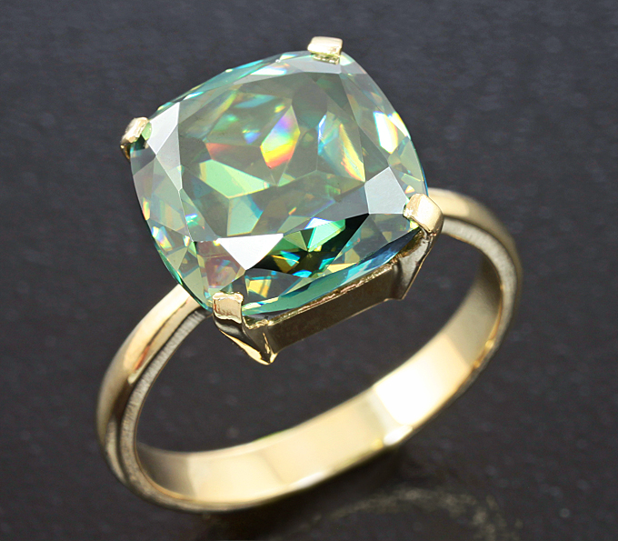 Вашему вниманию предлагается кольцо из желтого золота 585 пробы с крупным муассанитом! Площадка 10 х 10 мм, высота 7 мм. Вес изделия 3,6 г. Размер 17,5. Ниже приводятся ювелирные характеристики вставки.