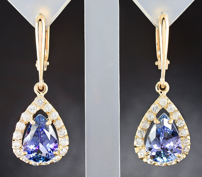 Вашему вниманию предлагаются серьги из желтого золота 585 пробы с чистейшими танзанитами и бесцветными цирконами! Диаметр цирконов 2 мм. Размеры серег с петлей 35 х 13 мм. Вес пары 5,4 г. Ниже приводятся ювелирные характеристики танзанитов.