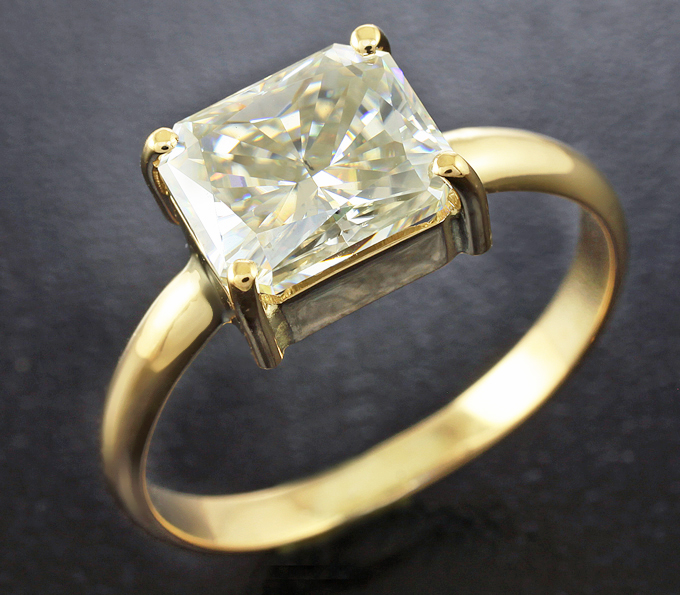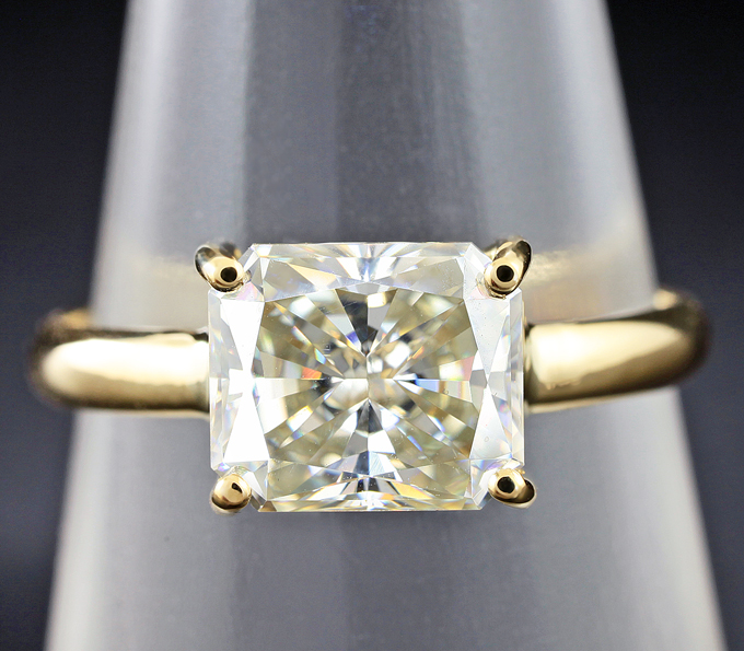 Вашему вниманию предлагается кольцо из золота 750 пробы с бесцветным муассанитом! Площадка 9 х 7 мм, высота 4 мм. Вес изделия 2,5 г. Размер 17,5. Ниже приводятся ювелирные характеристики вставки.