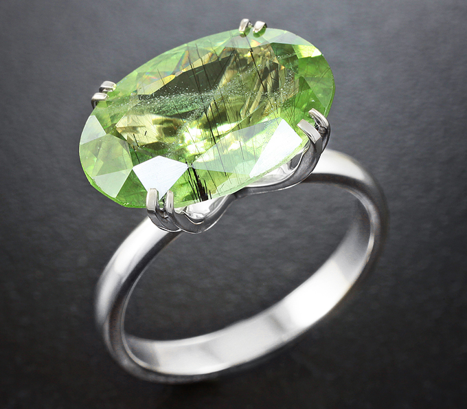 Вашему вниманию предлагается кольцо из белого золота 585 пробы, инкрустированное перидотом с рутилом! Размеры вставок 15 х 10 мм. Площадка 15 х 10 мм, высота 9 мм. Вес изделия 4,2 г. Размер 16,75. Ниже приводятся ювелирные характеристики вставки.