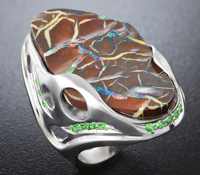 Вашему вниманию предлагается кольцо из стерлингового серебра (925 проба) c австралийским болдер опалом и цаворитами гранатами! Основные цвета опалесценции: красный, зеленый и синий. Диаметр дополнительной инкрустации 2 мм. Площадка 34 х 19 мм, высота 4 мм. Вес изделия 11,6 г. Размер 18. Ниже приводятся ювелирные характеристики вставки.