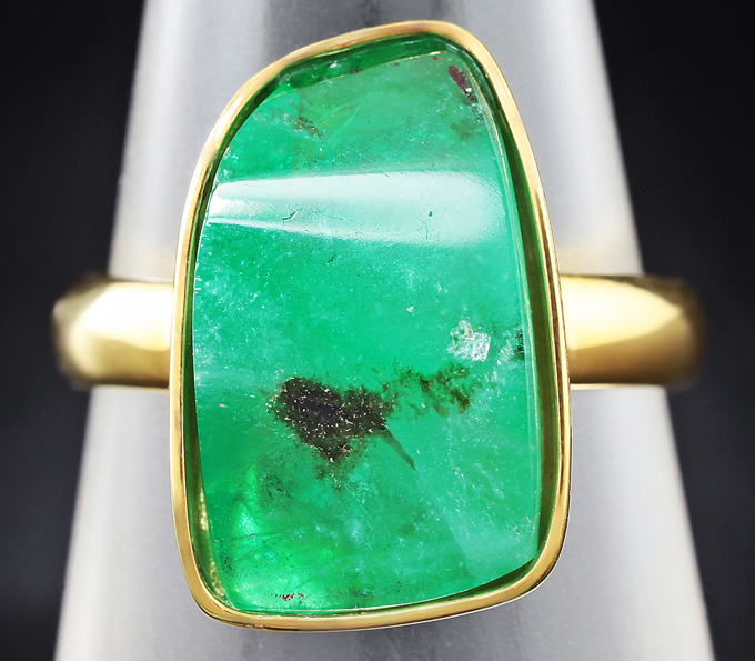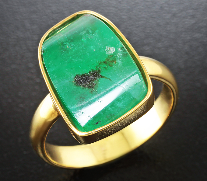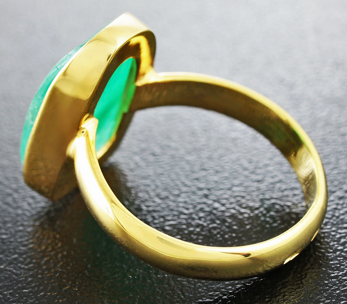 Вашему вниманию предлагается кольцо из желтого золота 585 пробы с уральским изумрудом! Размеры вставок 15 х 9 мм. Площадка 16 х 11 мм, высота 5 мм. Вес изделия 4,5 г. Размер 17. Ниже приводятся ювелирные характеристики вставки.