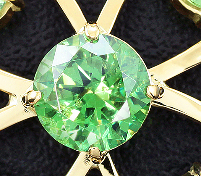 Вашему вниманию предлагается кулон из желтого золота 750 пробы с демантоидами общей массой 5,03 карат и бриллиантами! Диаметр вставок от 1 мм до 9 мм. Размеры кулона с петлей 43 х 23 мм. Вес 8,7 г. Ниже приводятся ювелирные характеристики меньших демантоидов.