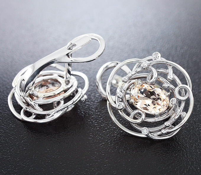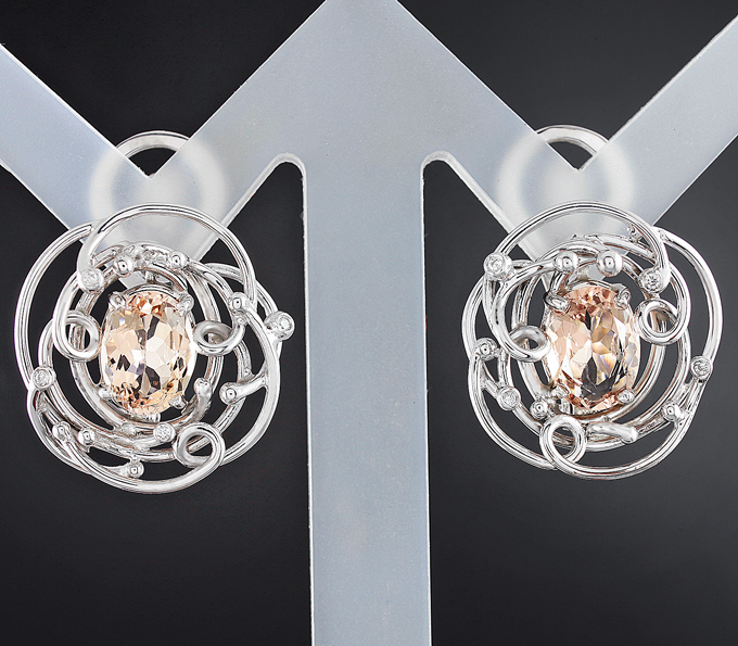 Вашему вниманию предлагаются серьги из белого золота 585 пробы с морганитами и бриллиантами! Диаметр дополнительной инкрустации 1 мм. Площадка серег 19 х 18 мм. Вес пары 6,3 г. Ниже приводятся ювелирные характеристики вставок.