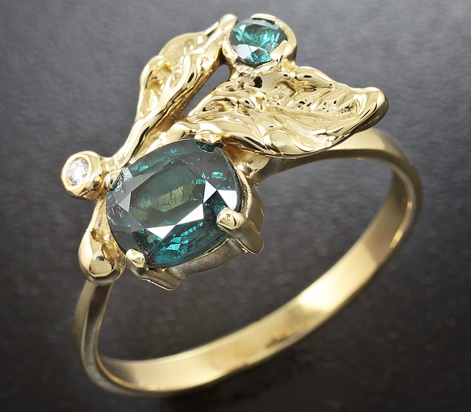 Кольцо, инкрустированное гранатами с александритовым эффектом и бриллиантом