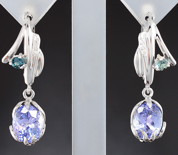 Вашему вниманию предлагаются серьги из белого золота 585 пробы с танзанитами, гранатами со сменой цвета и бриллиантами! Размеры вставок от 2 мм до 8 х 6 мм. Размеры серег с петлей 29 х 10 мм. Вес пары 5 г. Ниже приводятся ювелирные характеристики танзанитов.