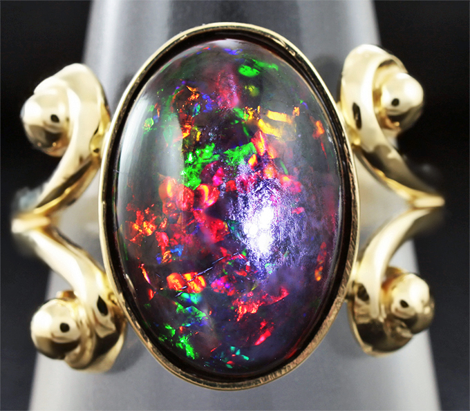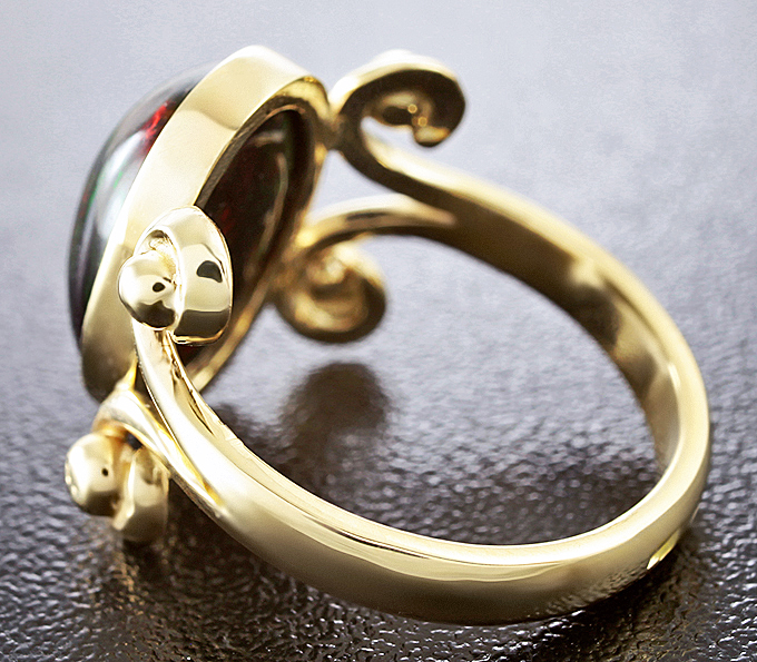 Вашему вниманию предлагается кольцо из желтого золота 585 пробы с кристаллическим черным опалом! Основные цвета опалесценции: красный, желтый и зеленый. Площадка 18 х 16 мм, высота 6 мм. Вес изделия 5,4 г. Размер 17,5. Ниже приводятся ювелирные характеристики вставки.