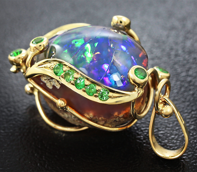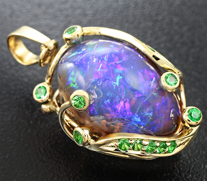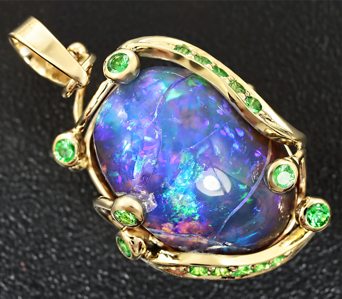 Кулон с кристаллическим эфиопским опалом и цаворитами гранатами