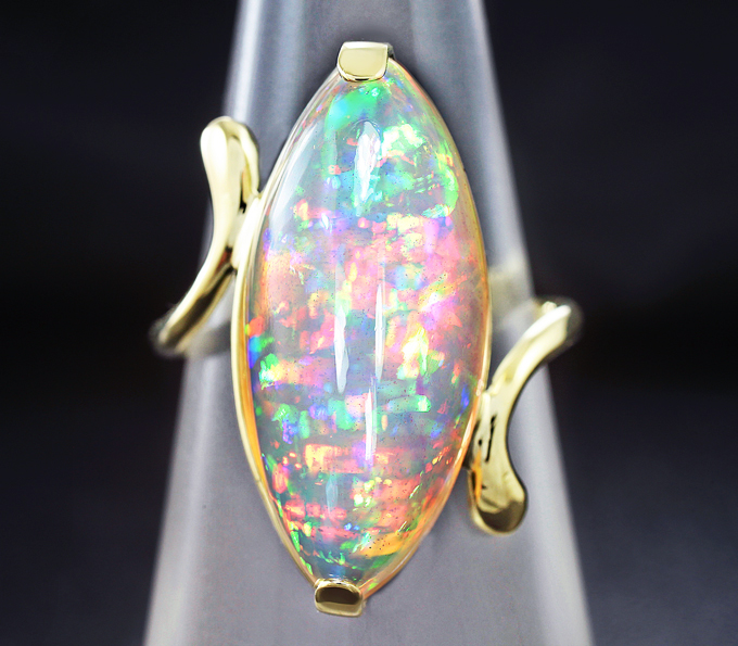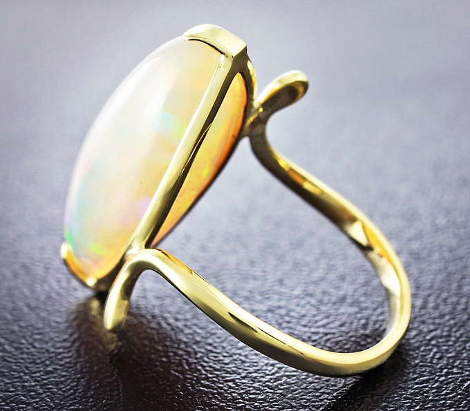 Вашему вниманию предлагается кольцо из желтого золота 585 пробы c кристаллическим Welo опалом! Основные цвета опалесценции: красный, желтый и зеленый. Размеры вставок 21 х 9 мм. Площадка 23 х 15 мм, высота 8 мм. Вес изделия 3,5 г. Размер 16. Ниже приводятся ювелирные характеристики.