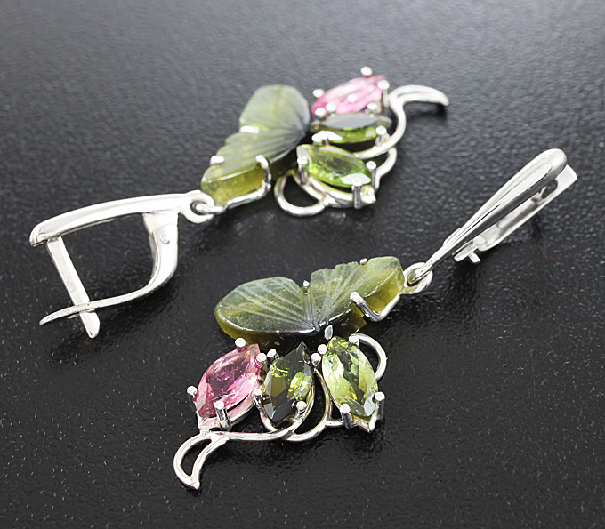 Вашему вниманию предлагаются серьги из стерлингового серебра (925 проба) с турмалинами! Размеры дополнительной инкрустации 8 х 4 мм. Размеры серег с петлей 43 х 19 мм. Вес пары 5,5 г. Ниже приводятся ювелирные характеристики резных турмалинов.