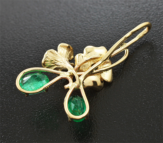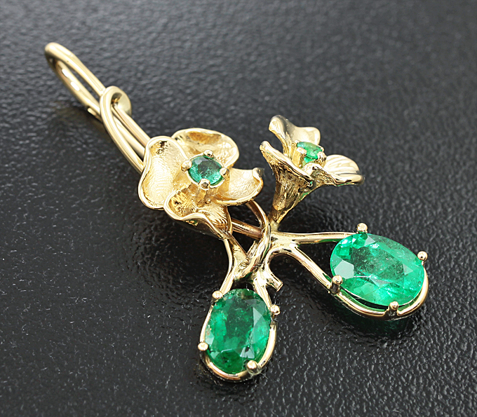 Вашему вниманию предлагается кулон из желтого золота 585 пробы с изумрудами массой 1,39 карат! Диаметр дополнительной инкрустации 2 мм и 2,5 мм. Размеры кулона с петлей 36 х 20 мм. Вес 3,2 г. Ниже приводятся ювелирные характеристики крупных изумрудов.