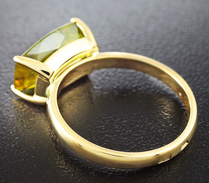Вашему вниманию предлагается кольцо из желтого золота 585 пробы с золотистым сфеном! Площадка 12 х 7 мм, высота 6 мм. Вес изделия 3,4 г. Размер 17. Ниже приводятся ювелирные характеристики вставки.