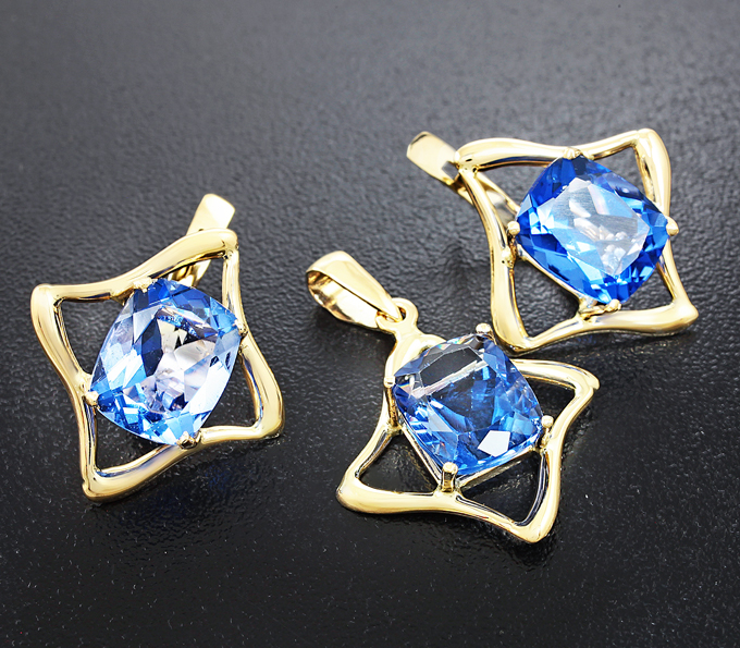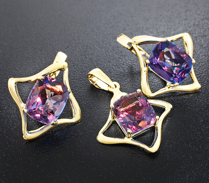 Вашему вниманию предлагается комплект (серьги + кулон) из желтого золота 585 пробы с флюоритами! При смене освещения, камни меняют цвет с синего на фиолетовый. Вес комплекта 7,6 г.