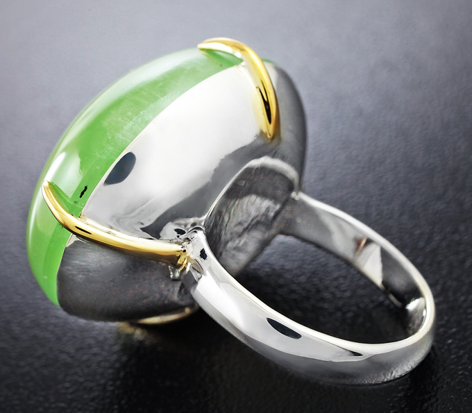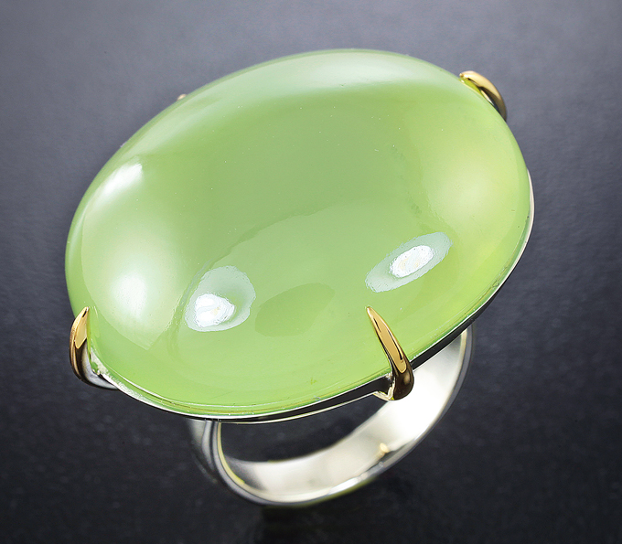 Вашему вниманию предлагается кольцо из стерлингового серебра (925 проба) c крупным пренитом! Изделие частично позолочено. Размеры вставки 27 х 23 мм. Площадка 30 х 26 мм, высота 14 мм. Вес изделия 19,8 г. Размер 17. Ниже приводятся ювелирные характеристики вставки.