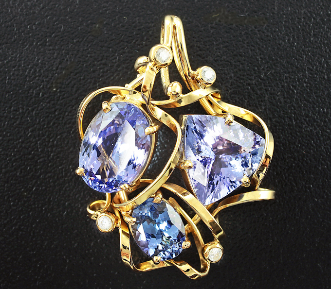 Вашему вниманию предлагается кулон из стерлингового серебра (925 проба) с танзанитами и бесцветными цирконами! Изделие позолочено. Диаметр дополнительной инкрустации 2 мм. Площадка кулона 34 х 26 мм. Вес 6,7 г. Ниже приводятся ювелирные характеристики танзанитов.