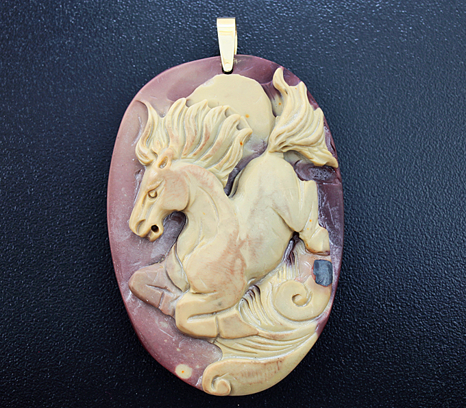 Вашему вниманию предлагается замечательный образец камнерезного искусства – камея-подвеска «Мустанг» из желтого золота 585 пробы и цельной яшмы! Ручная работа! Не подвергалась окрашиванию. Размеры с петлей 67 х 42 х 11 мм. Вес 38,4 г.