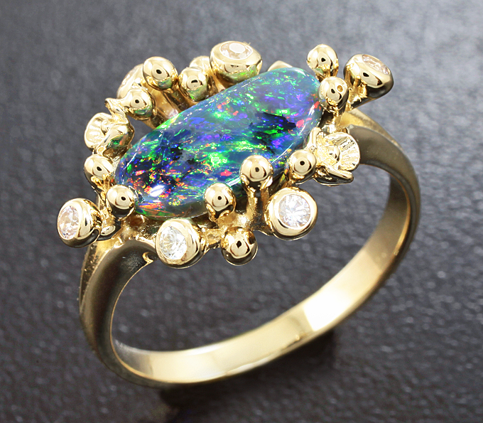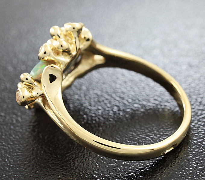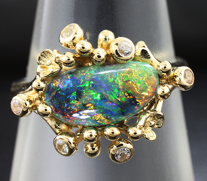 Вашему вниманию предлагается кольцо из желтого золота 585 пробы с solid опалом массой 1,16 карат и лейкосапфирами! Основные цвета опалесценции: желтый, зеленый и синий. Размеры вставок 1,5 мм и 11 х 5 мм. Площадка 18 х 14 мм, высота 5 мм. Вес изделия 4,1 г. Размер 17.