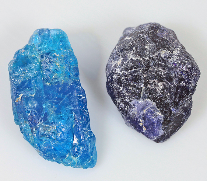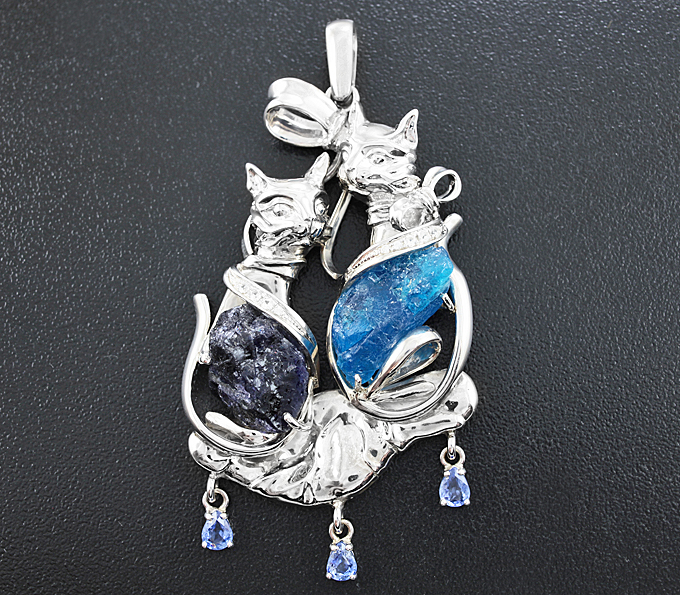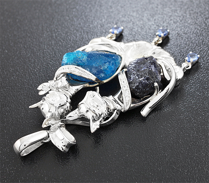 Кулон с необработанными апатитом и иолитом, а также синими и бесцветными сапфирами