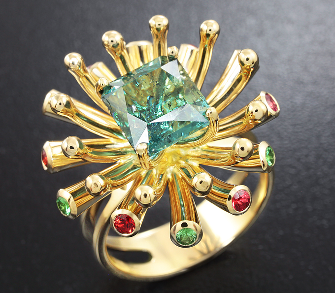 Кольцо с синим турмалином, рубинами и цаворитами гранатами