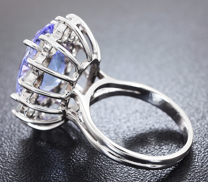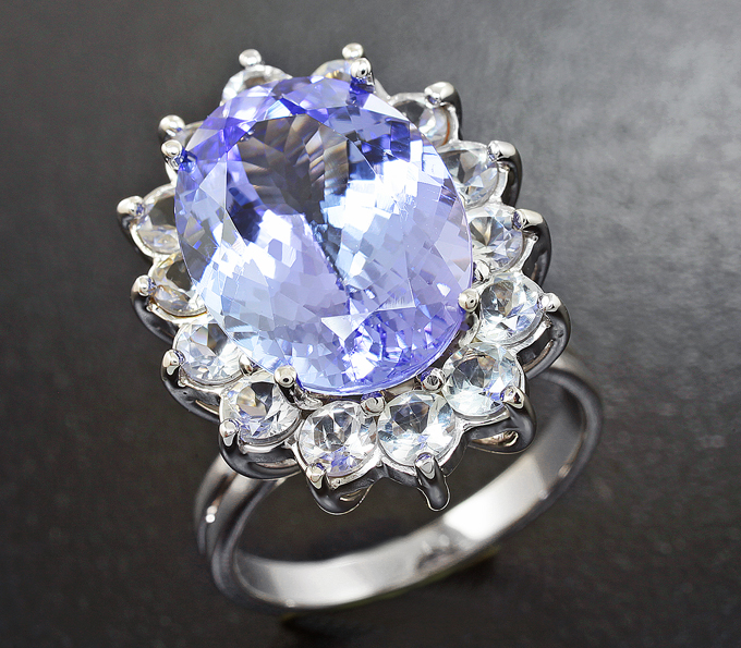 Вашему вниманию предлагается кольцо из белого золота 585 пробы с крупным танзанитом и лейкосапфирами! Диаметр сапфиров 3 мм. Площадка 22 х 17 мм, высота 14 мм. Вес изделия 7,7 г. Размер 17,25. Ниже приводятся ювелирные характеристики танзанита.