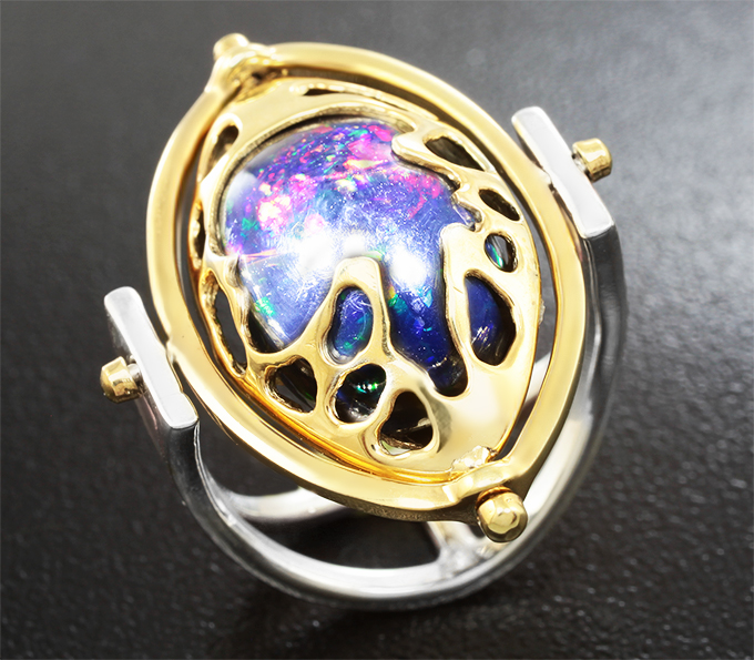 Вашему вниманию предлагается кольцо-кулон из стерлингового серебра (925 проба) c кристаллическим черным опалом массой 6 карат! Легким движением кольцо трансформируется в кулон и обратно. Двусторонняя площадка! Изделие частчино позолочено. Основные цвета опалесценции: зеленый, желтый и синий. Размеры вставки 16 х 11 мм. Площадка кольца 30 х 24 мм, высота 7 мм. Вес изделия 6,5 г. Размер 17,25.