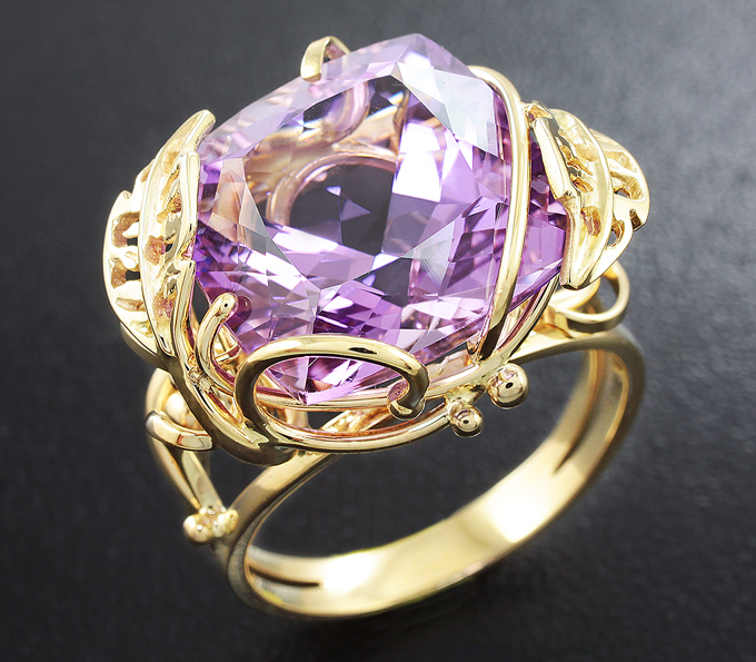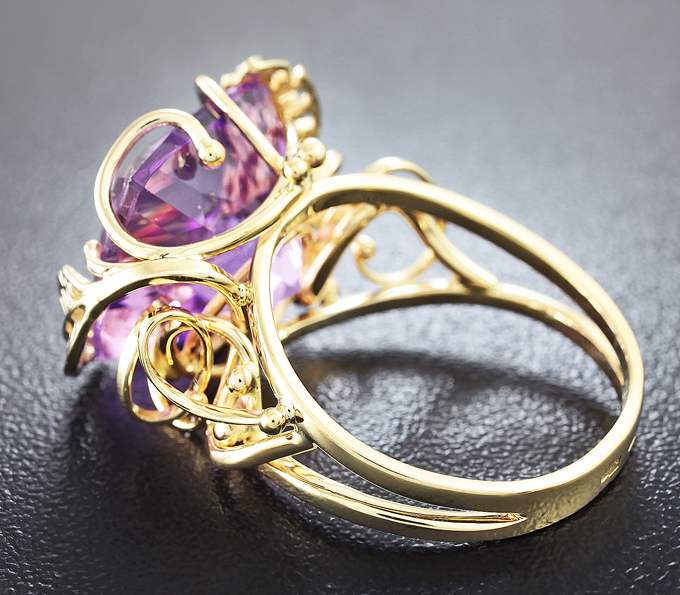 Вашему вниманию предлагается кольцо из желого золота 585 пробы c аметистом! Площадка 21 х 16 мм, высота 11 мм. Вес изделия 7,9 г. Размер 18,5. Ниже приводятся ювелирные характеристики вставки.