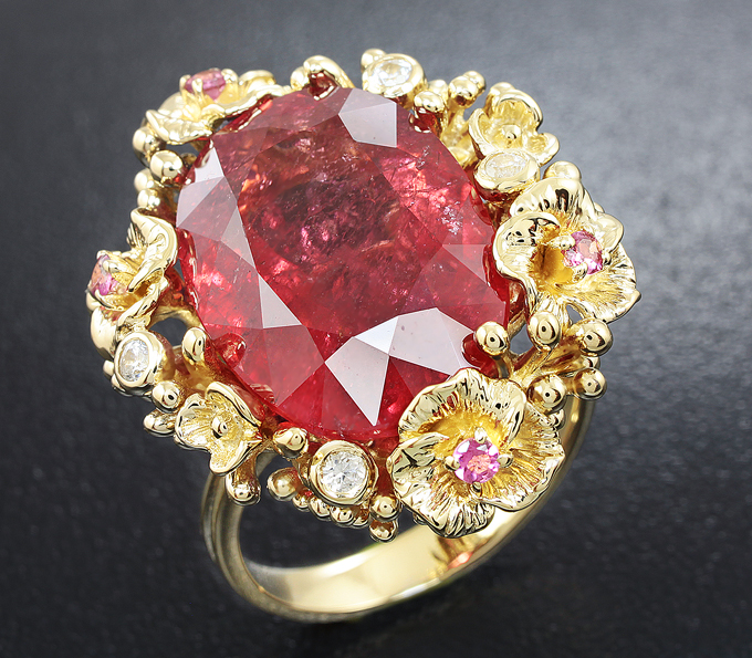 Вашему вниманию предлагается кольцо из желтого золота 585 пробы с красным турмалином, розовым турмалином и лейкосапфирами! Диаметр дополнительной инкрустации 2 мм. Площадка 29 х 23 мм, высота 10 мм. Вес изделия 13,9 г. Размер 19. Ниже приводятся ювелирные характеристики вставки.