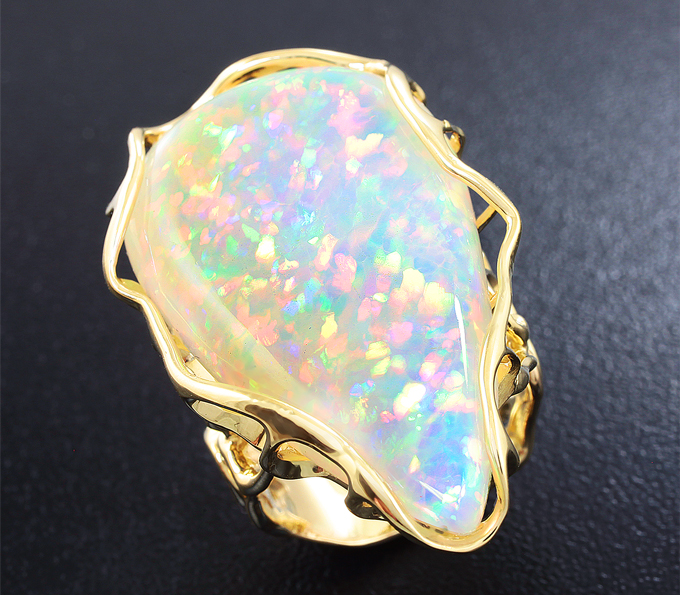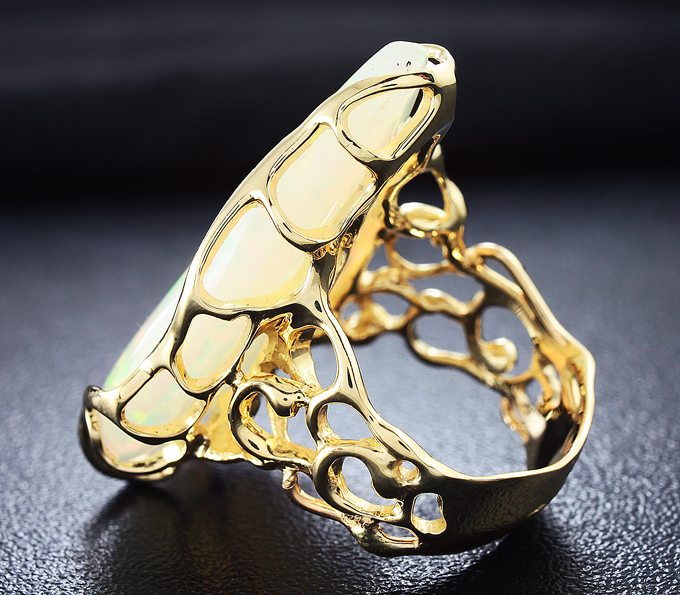 Вашему вниманию предлагается кольцо из желтого золота 585 пробы с потрясающим крупным кристаллическим опалом! Основные цвета опалесценции: красный, желтый и зеленый. Площадка 35 х 22 мм, высота 7 мм. Вес изделия 11 г. Размер 16,25. Ниже приводятся ювелирные характеристики вставки.