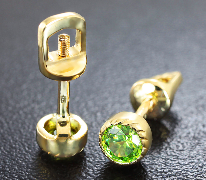 Вашему вниманию предлагаются пусеты из желтого золота 585 пробы с демантоидами гранатами! Площадка пусет 5 мм. Вес пары 2,1 г. Ниже приводятся ювелирные характеристики вставок.