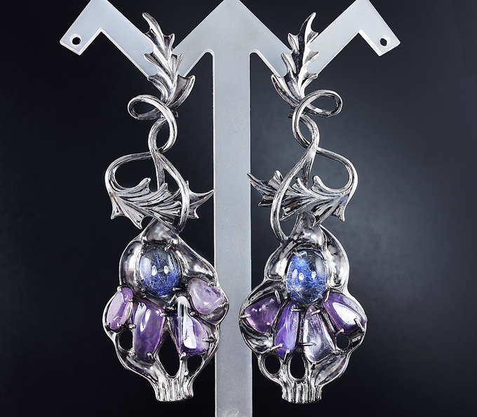 Вашему вниманию предлагаются серьги из стерлингового серебра (925 проба) с дьюмортьеритами и аметистами! Изделие с чернением. Размеры вставок от 8 х 6 мм до 13 х 7 мм. Площадка серег 83 х 28 мм. Вес пары 35,7 г.