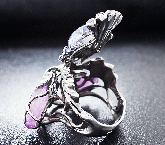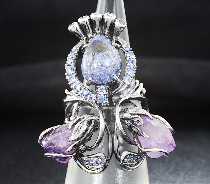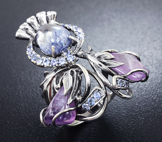 Кольцо c дьюмортьеритом, аметистами и танзанитами