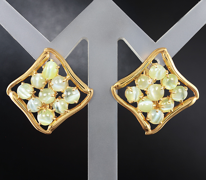 Серьги с хризобериллами с эффектом «кошачьего глаза»