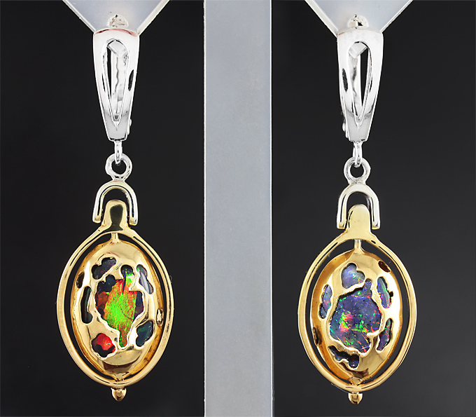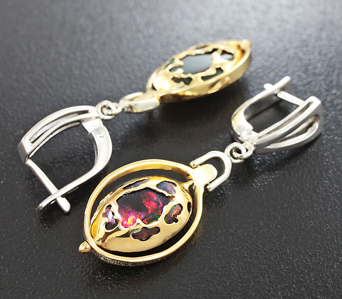 Вашему вниманию предлагаются серьги из стерлингового серебра (925 проба) с кристаллическими черными опалами массой 5,08 карат! Изделие частично позолочено. Основные цвета опалесценции: красный и зеленый. Оправа опалов закреплена мобильно и вращается вокруг своей оси. Размеры серег с петлей 44 х 14 мм. Вес пары 6,8 г. Ниже приводятся ювелирные характеристики вставок.